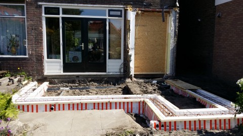 Bij de onderstaande aanbouw hebben we eerst een stuk oude aanbouw weggesloopt omdat deze was gaan verzakken. daarna hebbenwe heipalen dee grond in laten slaan en een mooie nieuwe aanbouw met lichtstraat terug gebouwd.