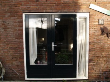 Omschrijving: Het vervangen van een alluminium schuifpui voor een hardhouten kozijn met tuindeuren.