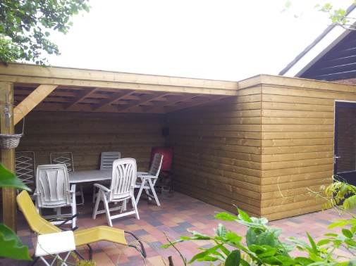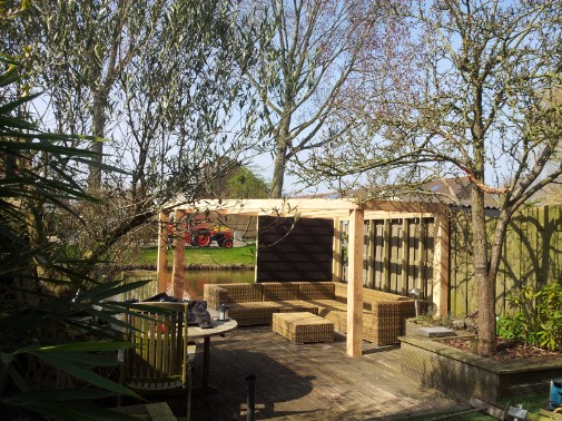 Omschrijving: Het maken van een verranda van douglas hout en betimmerd met zweeds rabat.