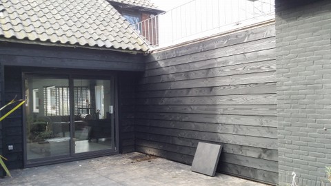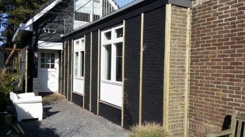 Onderstaand diverse foto's van een bestaande gevel die we hebben betimmerd met Dougls zweeds rabat.